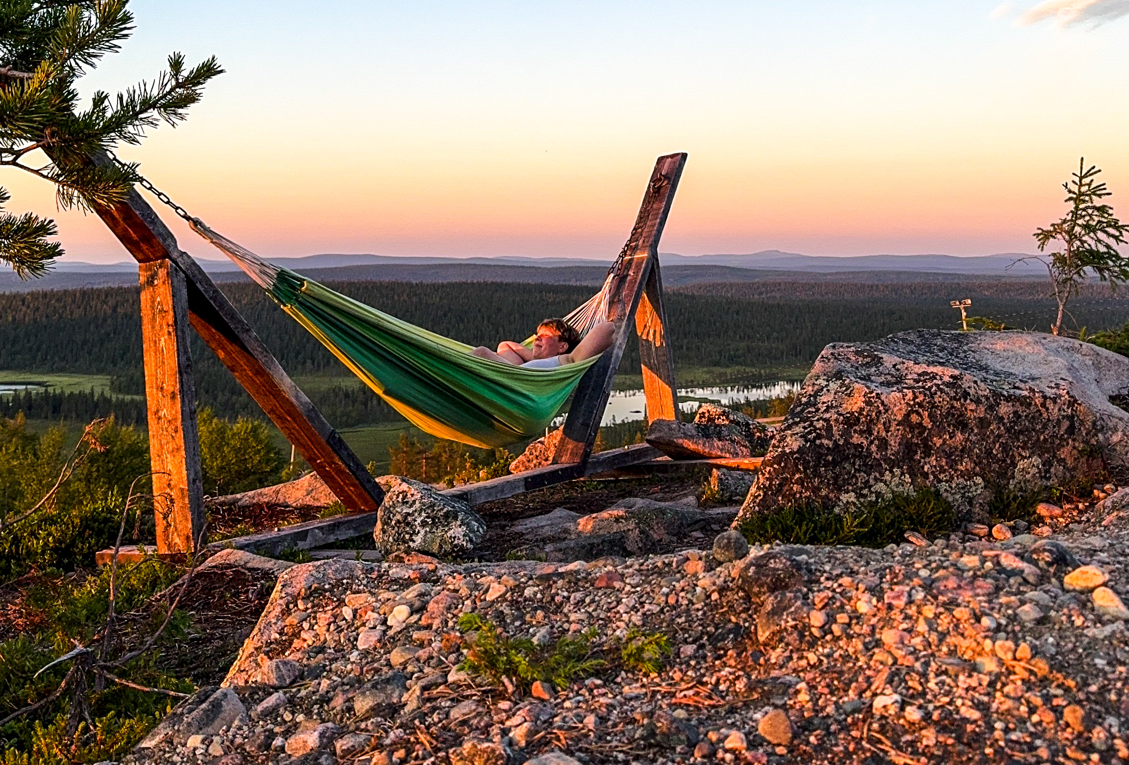 Oikea reitti maastopyörällä huipulle lähtee Keloravintolan takaa rinteeseen. Siinä laiduntaa kesäisin lampaita, se oli hyvä maamerkki. Huipulta löytyy useampi taukopaikka sekä huussi. Ihon kananlihalle laittava kokemus oli kuitenkin tunturissa olevat riippumatot, jossa köllöttelin ihailemassa yötöntä yötä. Riippumatot löytyvät, kun lähdet huipulta rinnettä hiukan alaspäin Venäjän suuntaan. Tässä vielä kartta, jost löytyy myös muut Aisti Salla -kohteet.